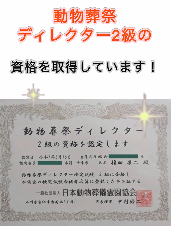 私、榎田は「動物葬祭ディレクター2級」の資格を保有しております。