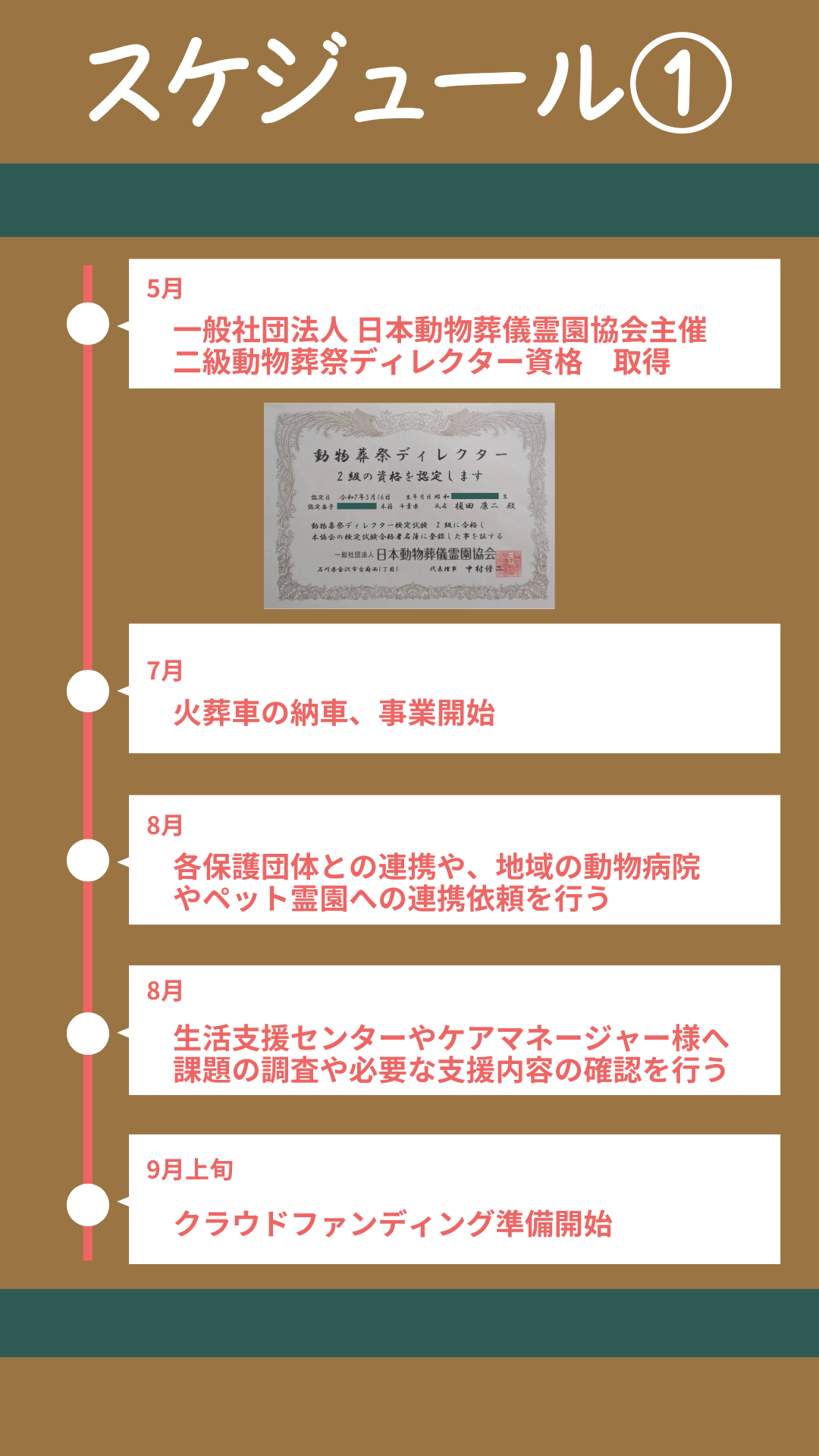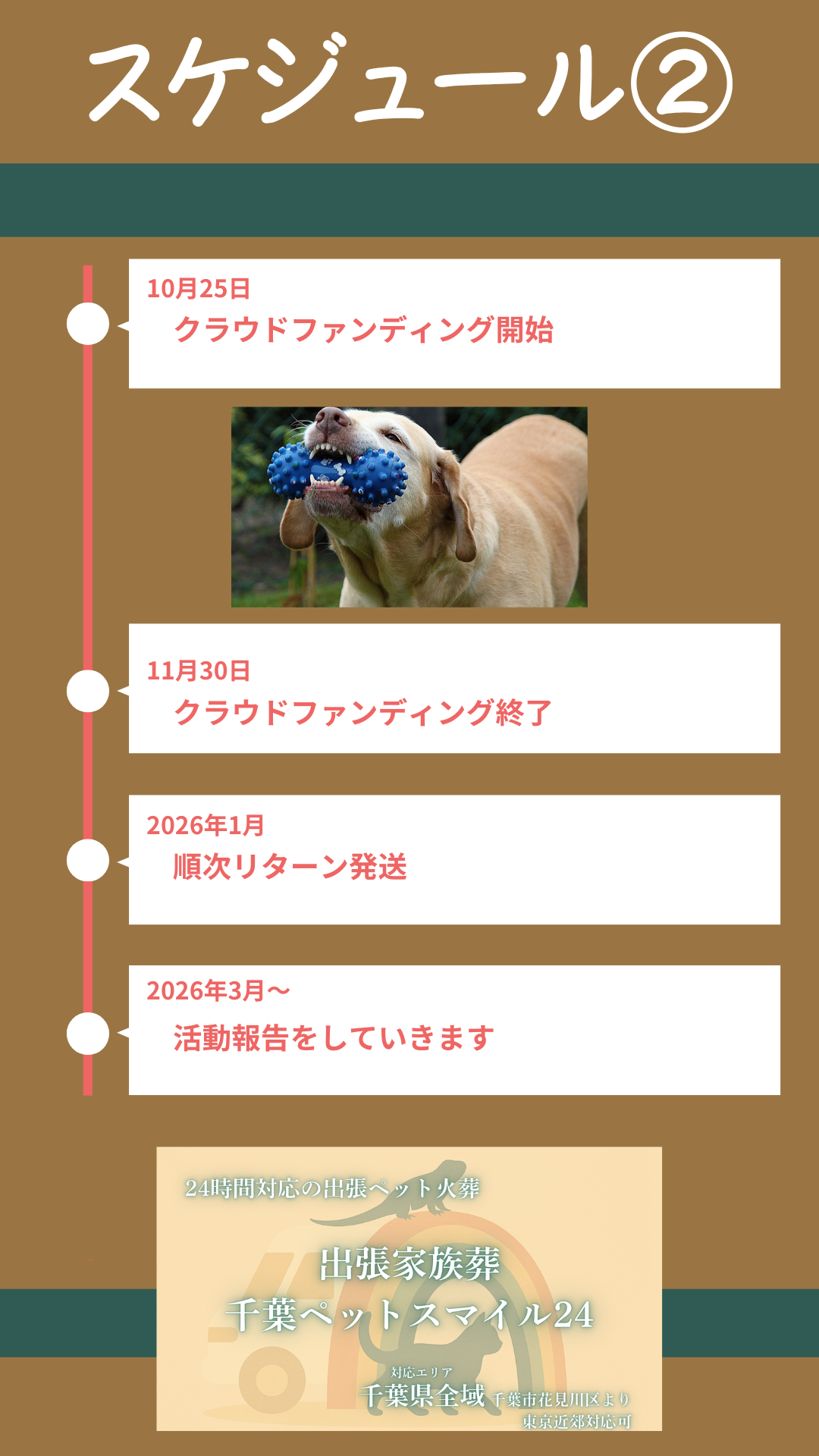 今回は、そのための活動費、特に安全基準を満たした火葬車の維持管理費を集めたいと思います。「出張家族葬 千葉ペットスマイル24」は、2025年7月に事業をスタートさせました。ペットとの最後の別れを、ご自宅で心ゆくまで、笑顔で送っていただきたいという一心で走り出しています。